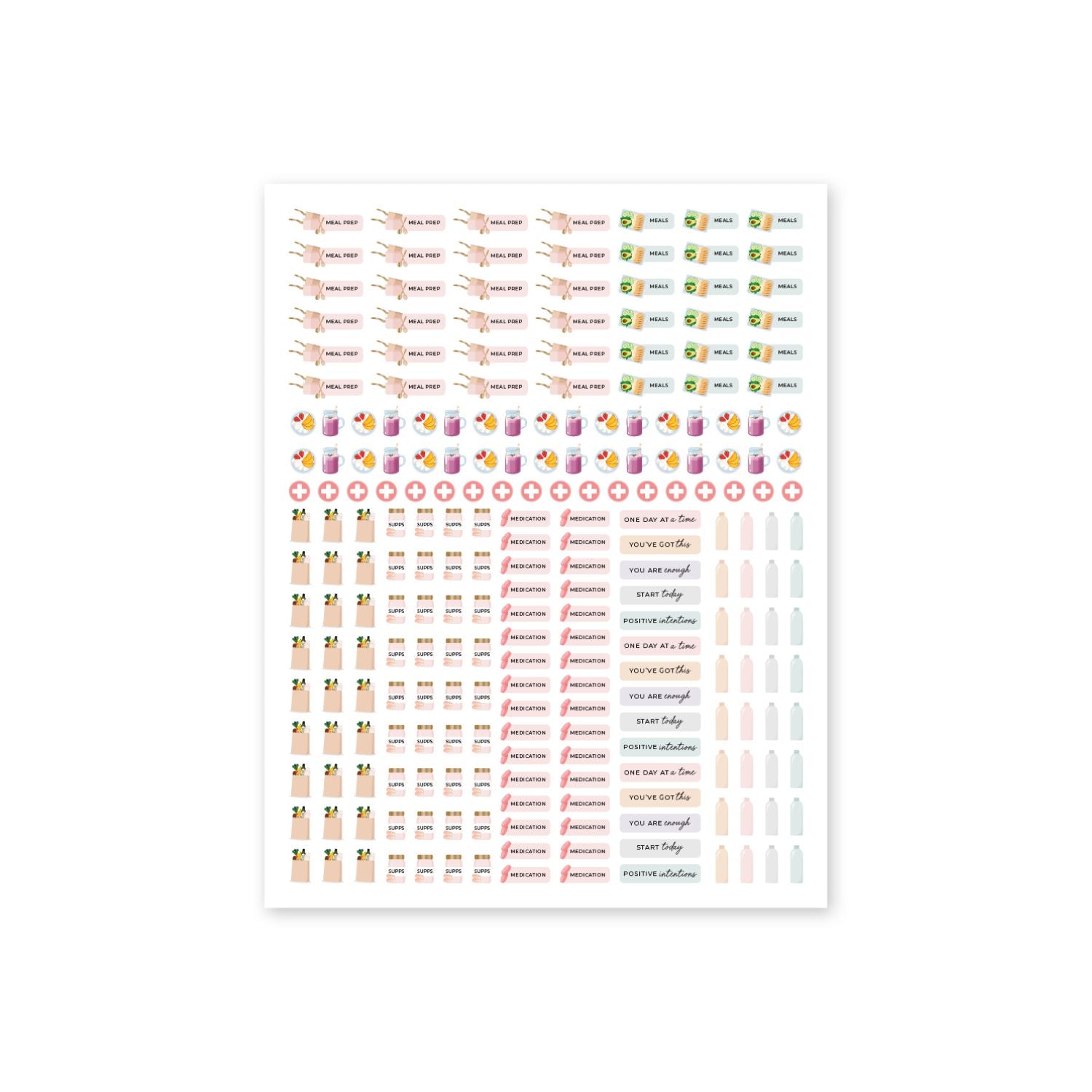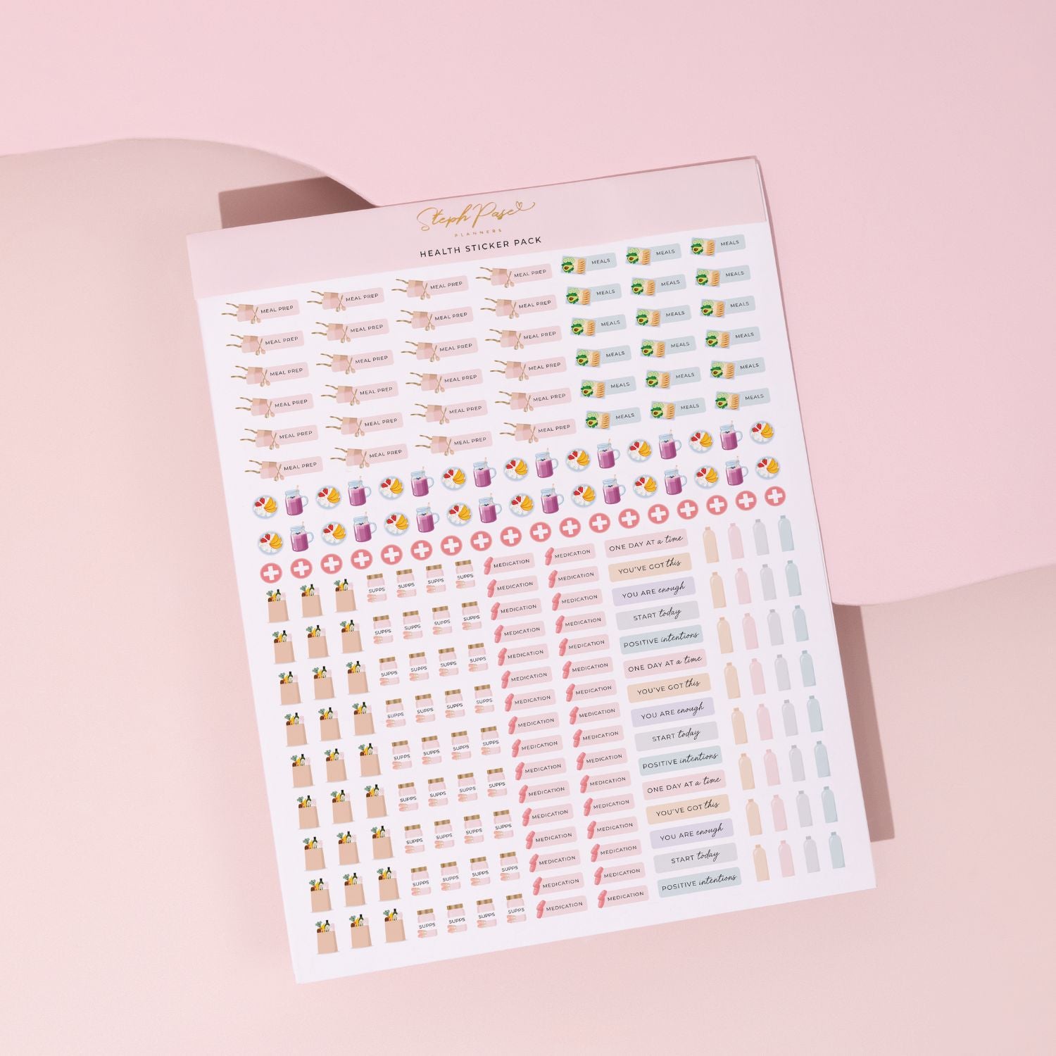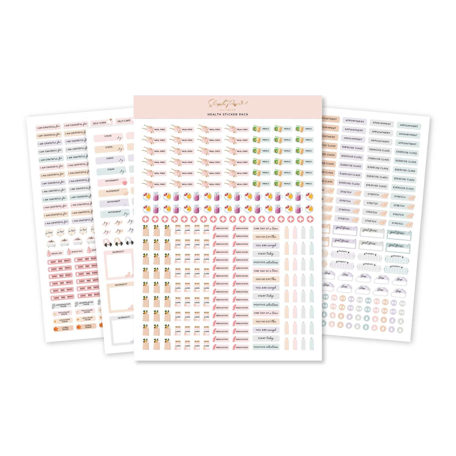 Newly revamped! The Health Sticker Pack helps you to put self-care on the priority list. Each pack has over 900 stickers to schedule in workouts, meal prep, relaxation, self-care, hydration, menstrual cycle and more. These pretty-yet-practical stickers are designed to fit perfectly onto your planner, calendar, or weekly or monthly desktop planner notepad.